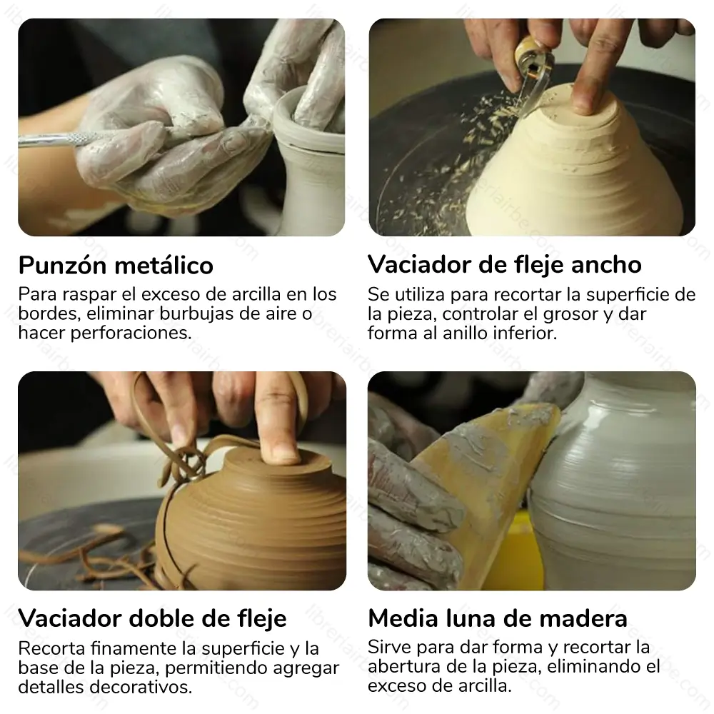 Media luna de madera: sirve para dar forma y recortar la abertura de la pieza, eliminando el exceso de arcilla.