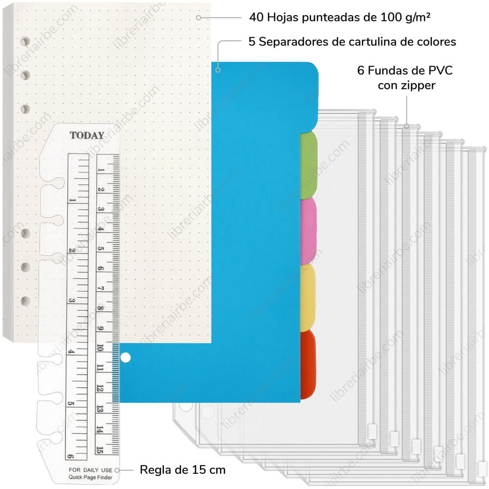 - 1 carpeta de cuero sintético tamaño A6 de 6 anillas con un diseño elegante.